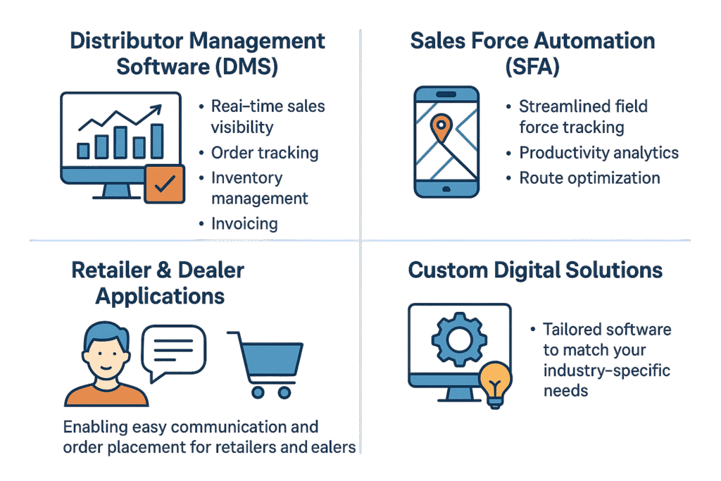 Distributor Management Software (DMS): Real-time sales visibility, order tracking, inventory management, and invoicing.
